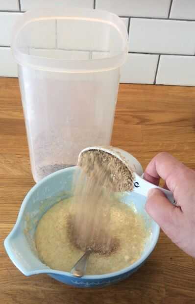 Con el 1/3 taza de medición, agregue 1/3 taza (1 cucharada) de salvado.