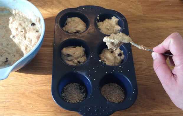 Utilizando la misma cucharadita como antes (¿por qué obtener otros platos sucios?), sacar la mezcla en el molde muffin 6.