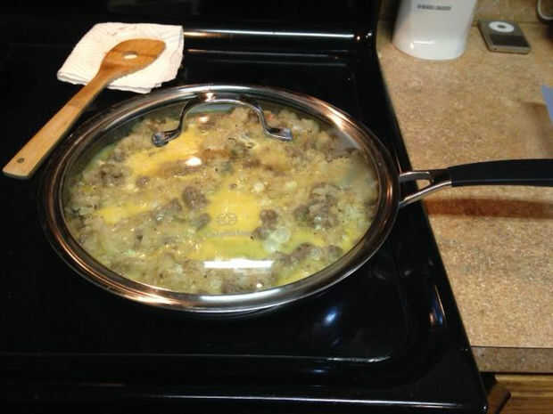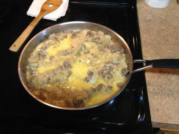 Ahora que se cocina por unos 15 minutos, sacar la tapa y añadir los huevos. Repartirlos en todo y en todos los rincones y grietas.