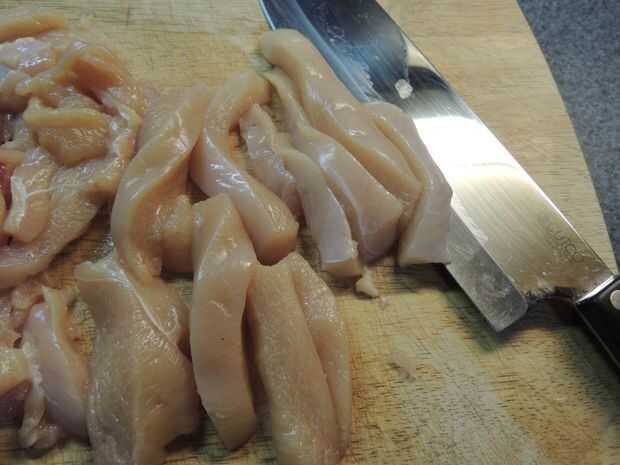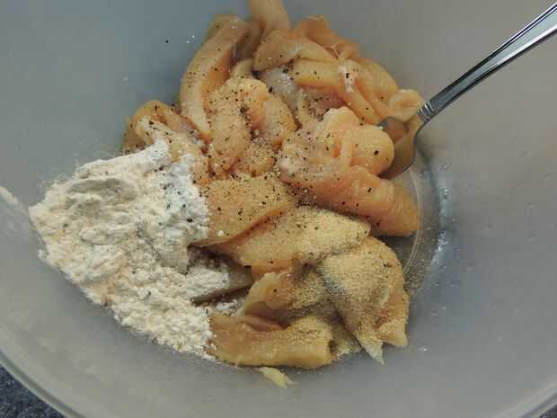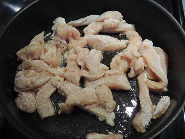 Cortar el pollo en tiras de 1/4 de pulgada y ponerlos en un bol. Añadir la harina, sal, ajo y pimienta y mezcla para cubrir el pollo. Calentar el aceite en una sartén grande a fuego alto. Añadir el pollo y cocinar por 3 minutos, sacudiendo con frecuencia para dar un cierre rápido por todos lados. Retirar el pollo y apartar.