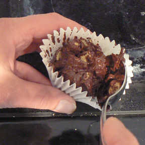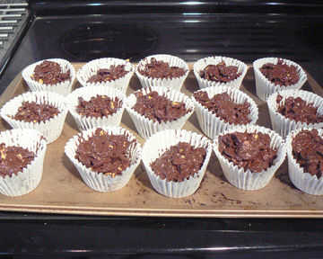 Vierta la mezcla en los revestimientos de la torta de la taza tan pronto como sea posible. Los copos de maíz cubiertos chocolate son más fáciles de manejar cuando el chocolate está caliente.