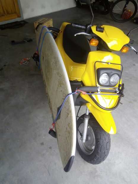 La primavera pasada finalmente compré mi tabla de surf. Porque su verano en Nueva Zelanda en el momento bañando ser molestado llevar tablas de surf en mis manos para la playa. Así que decidí construir otro estante para el scooter. Esta vez el scooter es mio :)