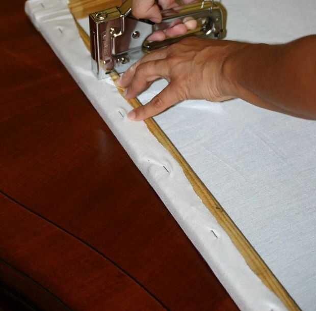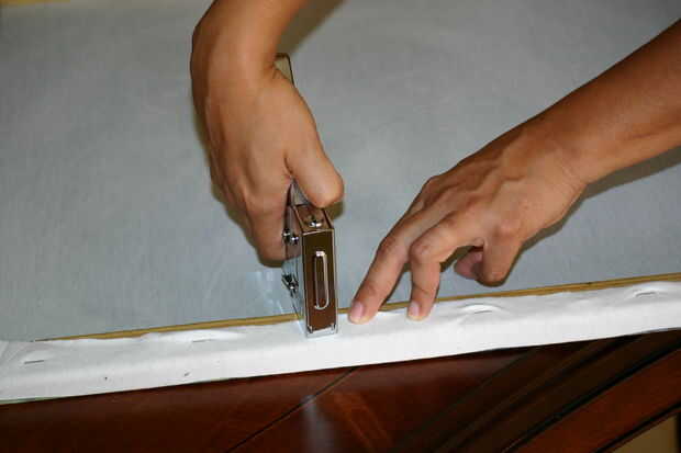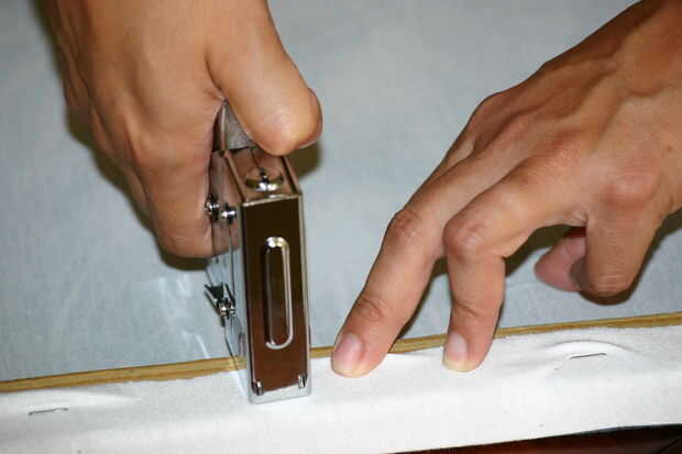 Colocar a la tela en una superficie limpia derecho hacia abajo y coloque el marco de madera sobre él. Estire a la tela en los bordes de la estructura de madera y grapas abajo va alrededor del marco. Cuando termine, cortar a cualquier tela sobrante que es sin garantía.