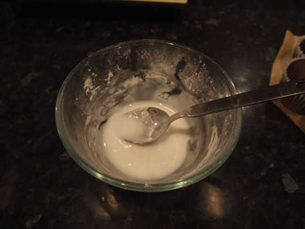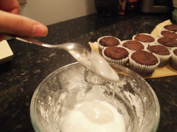 Tomar 50 gramos de azúcar glas y hacer un pozo en el centro. Añadir el agua fría una cucharadita a la vez, mezclando hasta tener una mezcla suficiente líquido que goteará fuera de la parte posterior de una cuchara, pero no se extenderá al rociados en el Magdalena. Poner tus cupcakes en pergamino para reducir el potencial desastre, y luego salpicar sus magdalenas hasta que tu corazón está contento. Dejar que el glaseado set, admirar y comer!