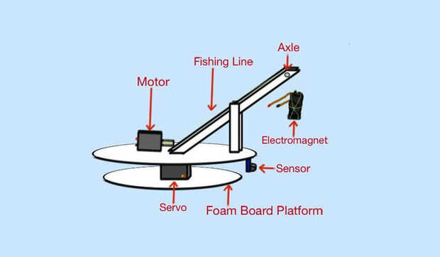 El motor quedará sujeta con cinta de enmascarar en la parte superior de la plataforma giratoria justo detrás del "brazo" de la grúa. Línea de pesca se unirá al motor, pasará a través de un eje colocado en la parte superior del "brazo" y celebrará el electroimán de forma segura.