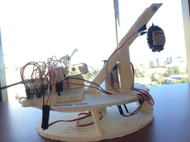 Ensamble "brazo" de la grúa como se muestra en la foto, con pegamento o cinta adhesiva. Para agregar seguridad adicional agregue patas hechas de tablero de la espuma en la parte inferior de la plataforma giratoria después de que el servo se une.