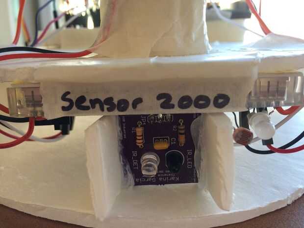 El IR y color sensores se colocará directamente debajo el electroimán en la plataforma giratoria. Un protoboard fue grabado boca abajo sobre la plataforma giratoria que conecta todos los circuitos del sensor y tenía cables de arranque conectar al tablero principal y la Arduino Uno en la parte superior de la placa giratoria. Asegúrese de mirar los sensores hacia afuera como se muestra en la foto de arriba. Agregar (si es necesario) de la espuma de las paredes de la Junta a los lados del sensor IR para evitar interferencias por el sensor de color y también para evitar la detección temprana de los objetos.