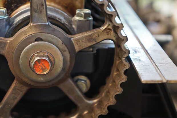 Ahora alinear el engranaje de la válvula con el borde de la superficie superior de la cabeza, asegurándose de que el rayo del centro es "arriba". Utilicé una regla de acero para ayudar a visualizar la alineación. Una vez alineados, deslice la correa de distribución sobre los dientes y hale el pasador en el tensor. El cinturón se ajuste muy bien sin mover los engranajes más allá de sus marcadores. Utilice un conector de 19mm y el tornillo del cárter del motor para mover los pistones un par de revoluciones en sentido contrario. Revise alineación; debe ser el mismo.
