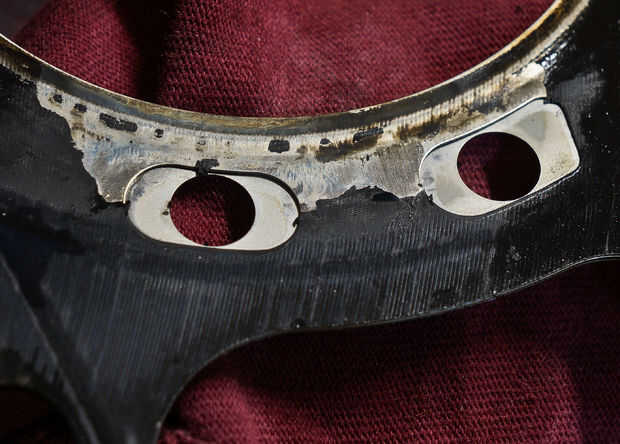 Imagen 5 detalle muestra sello de empaque negro había derretido una arrugada por caliente los gases de escape. Incluso parece que hay toque de rust, cerca de la pared del cilindro.