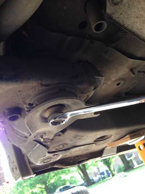 empecé a deshacer las monturas poco a poco para permitir que el subchasis a caer poco a poco, luego poner un gato debajo cuando pensé que los tornillos estaban recibiendo hasta el punto de salida. Probablemente más seguro para poner al gato debajo de antes. Mi manera trabajada y los 4 pernos vinieron deshacer muy fácilmente, el bastidor sólo caer ligeramente durante después del retiro de los pernos.