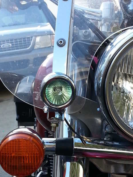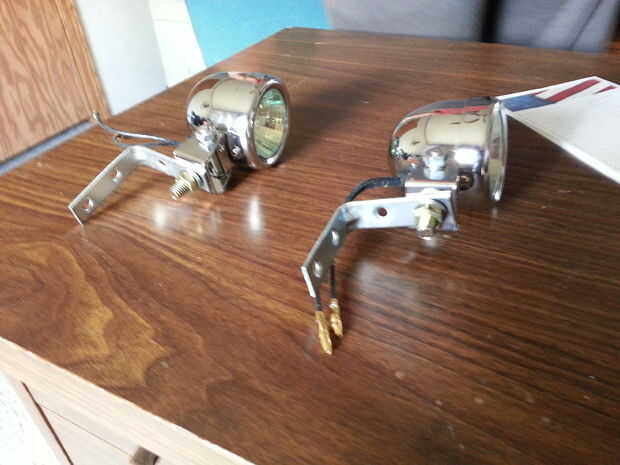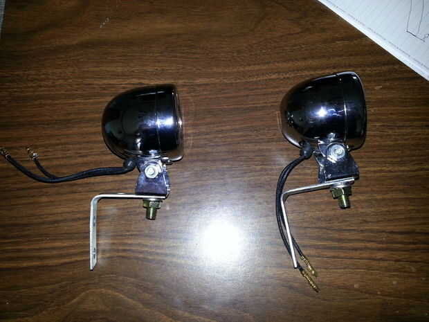 Compré un juego de luces cromado de autopartes Orielly por $22. Este juego no viene con un relé, pero por suerte tenia uno de otro proyecto. No voy a entrar en el cableado para ellos en una moto, ya ha sido golpeado como un caballo muerto. También tomé un juego de soportes de ángulo de Home Depot por $3. Tuve que abrir los orificios en el soporte un poco para permitir que los tornillos de ajuste sin tener que cambiarlos.