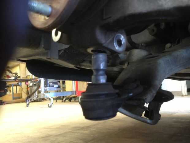 Bajo el control de brazo es la tuerca y el perno que sujeta la bola de conjunto en su lugar. Utilice el trinquete de 3/8 con un casquillo de 15mm y el otro lado con su llave de 15mm. Saque el perno completamente. Tome la palanca de la barra y coloque en la parte superior del brazo de control y golpeó con un martillo. En otros coches tienes que usar un tenedor para soltar la rótula. Afloje una vez Coloque la palanca entre la rótula y el brazo de control y la palanca hacia abajo en él. Asegúrese de no dañar el fuelle sobre la rótula.