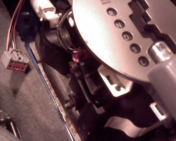 Con la consola fuera del camino, noto que la parte de plástico en el lado izquierdo de la palanca de cambios está sujeto a un cable, que tira de él hacia adelante cuando la clave no está en la posición 'on'. Va flojo cuando la clave es 'en' pero no hay ningún resorte para tirar de la pieza de plástico hacia atrás fuera del camino. Encontrar un lugar donde algo ha interrumpido, pero no encuentro un resorte o la pieza rota. Esto es cuando decido mejorar su sistema para que esto no vuelva a suceder.