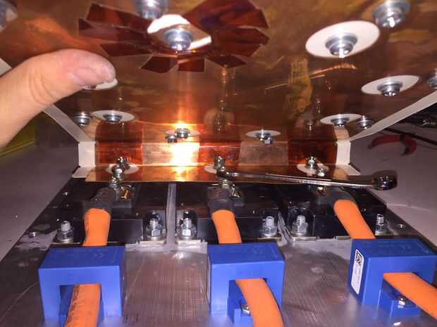 Para colocar el sandwich nomex/condensador para lo IGBTs, tienes que doblar un poco las hojas. Una vez que los tornillos en los agujeros IGBT, las cosas van bastante bien. Si por alguna razón las cosas no coinciden, a agrandar el agujero de montaje del IGBT de problema un bit.on la hoja de cobre.