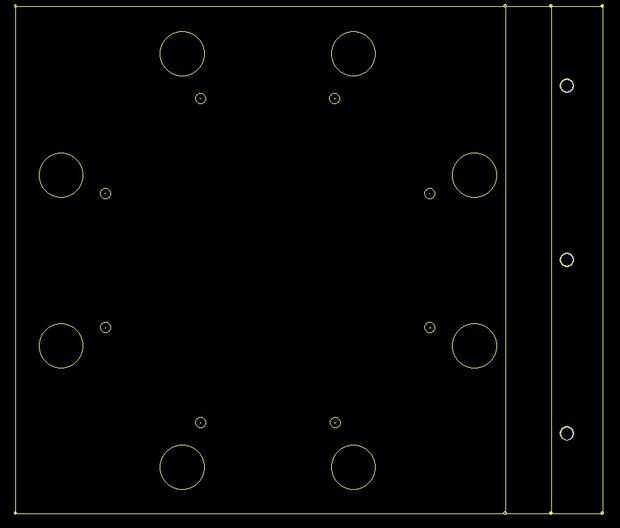 - Los 8 agujeros grandes que forman un anillo son todo diámetro 1,25 pulgadas, y sus coordenadas son (2,77, -0,4), (6.115, -0,4), (8.48,-2.765), (8.48,-6.115), (6.115,-8.48), (2.765,-8.48), (0,4,-6.115) y (0,4,-2.77).