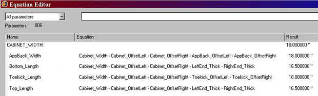 La columna de la ecuación muestra que la espalda, parte inferior, tapa y placa de protección se componen de varios otros parámetros. Vamos a ver en ellos cerca en el siguiente paso, pero quiero que se note que cada una de las ecuaciones comienza con la CABINET_WIDTH menos otros artículos. Así que si cambiamos CABINET_WIDTH a 36", cada una de las otras ecuaciones de parámetros empieza con 36" menos el resto.