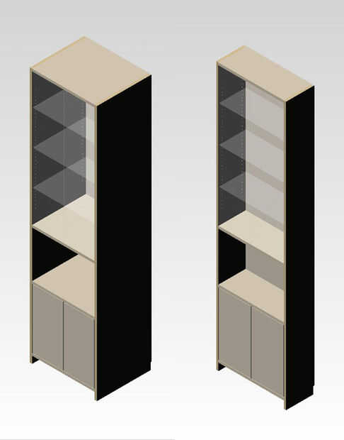 Veamos los dos armarios de abajo. Ambos tienen puertas con puertas de madera maciza y estantes abajo y baldas de cristal superior. La interdependencia de los parámetros me permitió diseñar el gabinete profundo de 24" a la izquierda. El sólo cambiar el parámetro CABINET_DEPTH, viola, tengo un 12" profundidad gabinete a la derecha.