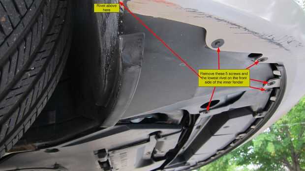 Hay cinco tornillos y un remache que usted tendrá que quitar para llegar a la luz de niebla.  Ver la imagen de abajo para la ubicación de estos cinco tornillos.  Quite el remache más bajo en la parte delantera del guardabarros interior.