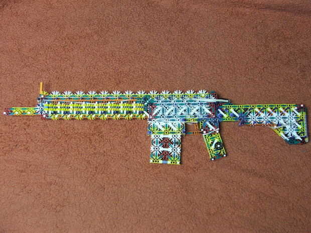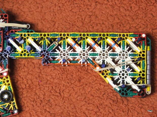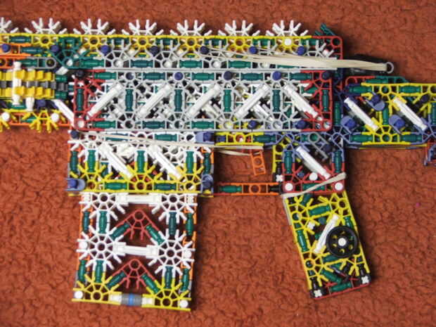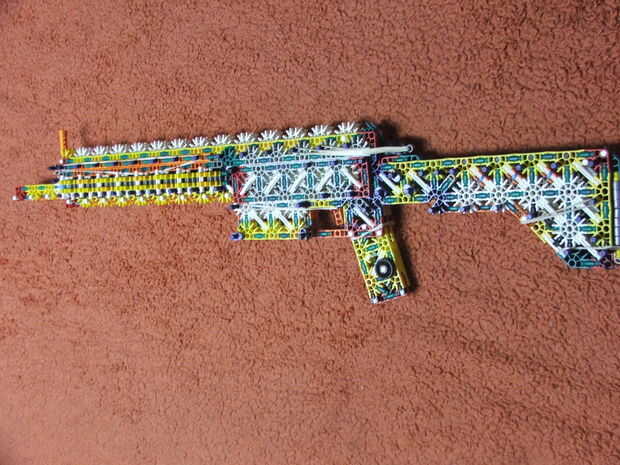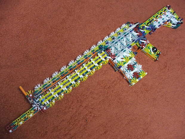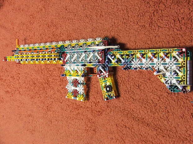 Créditos: KnexBuild.Tira 25 pies con dos bandas.La revista tiene 6 balas.Compartimiento extraíble.KnexBuild mecanismo de pasador de la barra.Gatillo de verdad reforzado.Trabajo diseño de cachorro de bull.Muy grande.Listo el carril.