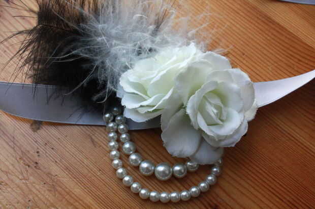 -una cinta (mina tuvo que ser plata, ya que tengo el pelo negro y las flores eran blancas, pero creo que negro realmente se vería mejor en el cabello más claro)