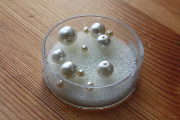 Luego debe elegir sus plumas y poner las perlas en un hilo. Como usted probablemente puede ver en la fotografía de la parte posterior lo hizo a la manera perezosa ponerlos en una sola cadena, varían de tamaño en los quince primeros y utiliza el mismo tamaño en los últimos 23. Los anillos del metal se utilizan en lugar de anudar la banda y sólo aprieta firmemente cuando están en la posición correcta. Lo que hice con mi tijera, porque olvidé traer pinzas y funciona igual de bien (si los tienes a la mano, que realmente debe usarlos aunque). Si usted decide ser perezoso como yo, recordar dejar las perlas movibles, para que - al separar las perlas en un solo lugar - todavía hay un espacio de 1 a 2 mm entre ellos.