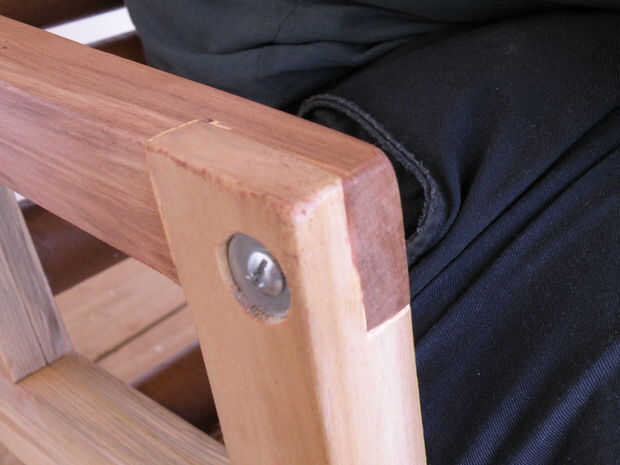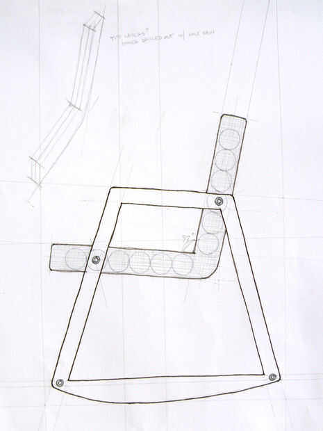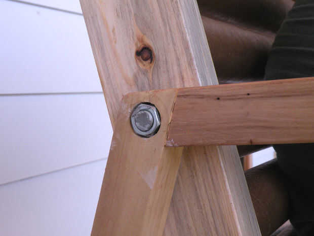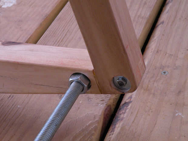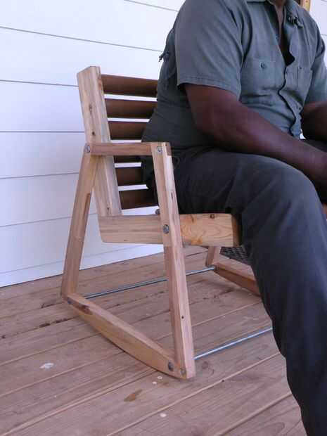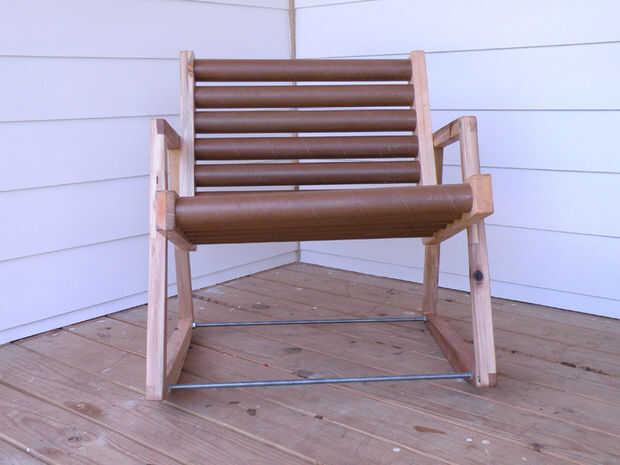 Los "A" dos marcos que conforman los ejes de balancín y los brazos se hacen de la madera de palet que llegó el metal del techo, que resultó para ser buena madera--creo que es chopo, pero no estoy seguro. Las plataformas se hacen a menudo de la madera dura debido al peso que deben soportar. El asiento se hizo de la sobras 2" x4" s y la superficie de asiento de los tubos de cartón que vienen en el centro de los rollos de papel que trama de nuestros dibujos en. Así, la silla materialmente hace referencia a la casa y el proceso por el cual llegó a ser. He hecho otro proyecto con estos tubos, que son muy fuertes, y puede verse aquí:.