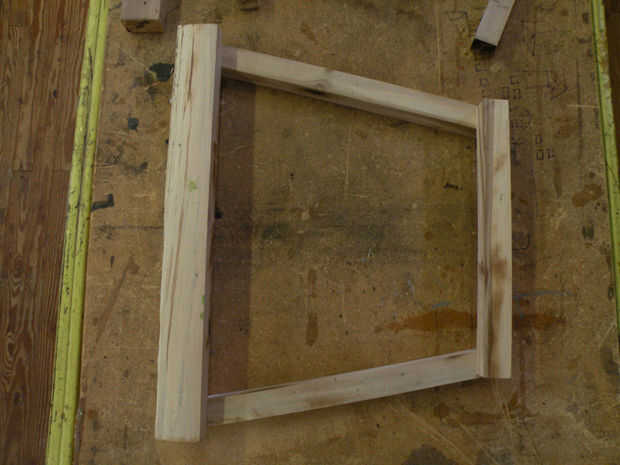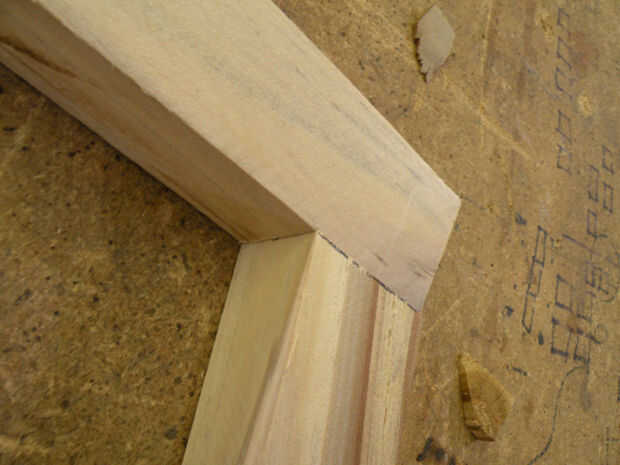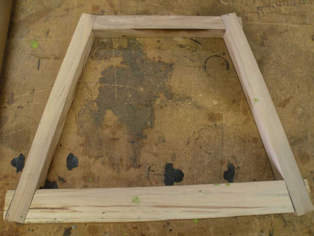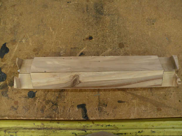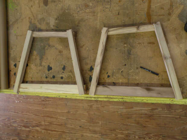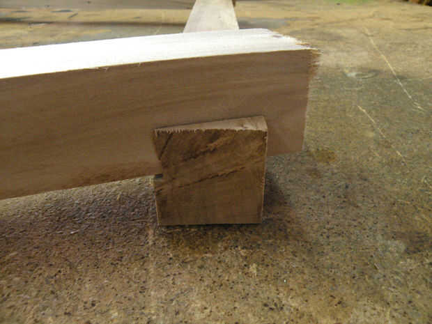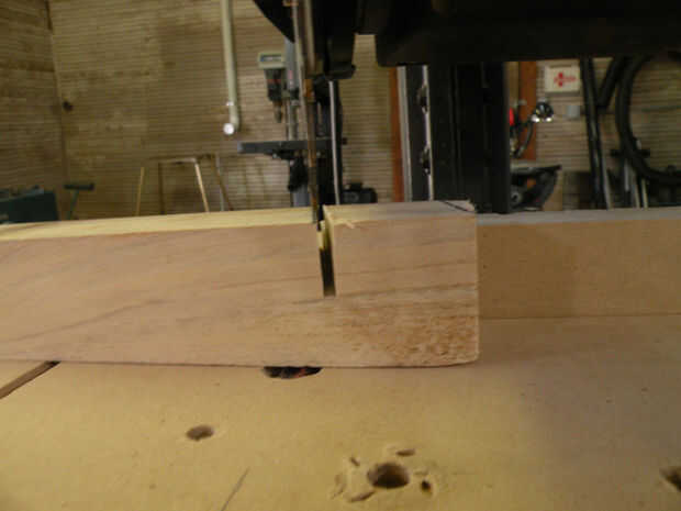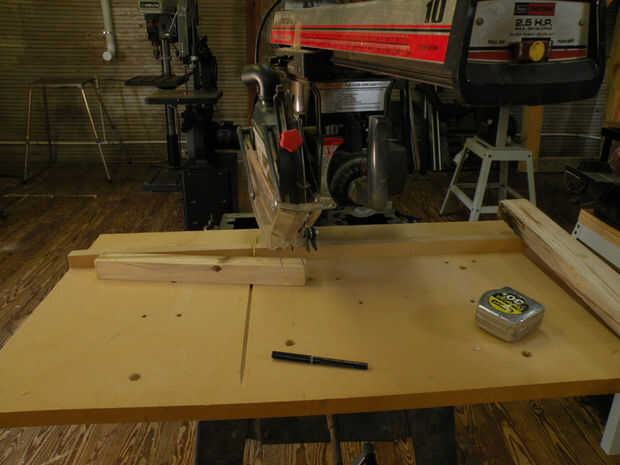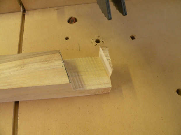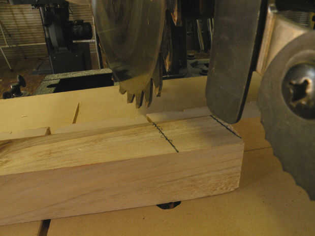 Me pareció el método más conveniente a utilizar un brazo radial vio. En primer lugar, cortar la madera recién molida según los dibujos en la primera página, con una sola pieza para el brazo y dos para los montantes de las piezas cuadradas de 1-1/4" y una sola pieza para el eje de balancín de 1-1/4" por 2-1/4" piezas. Ellos ponen sobre la mesa como se muestra y marque los ángulos de las articulaciones con un lápiz. Ajustar el ángulo de la Sierra de brazo radial coinciden con los ángulos de las articulaciones y la profundidad de la sierra para cortar a la mitad de la madera. Tirar un corte, deslice la madera sobre el ancho de la hoja, saque otro corte, enjuague y repita. Corte todas las muescas para todas las piezas de esta manera. Suena tedioso, pero realmente no se necesita mucho.