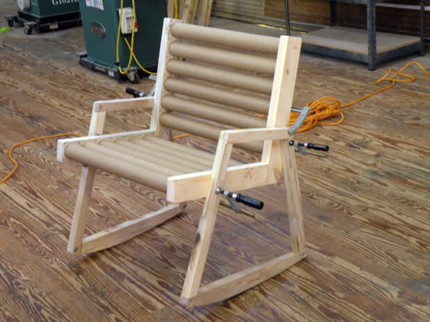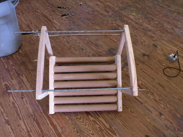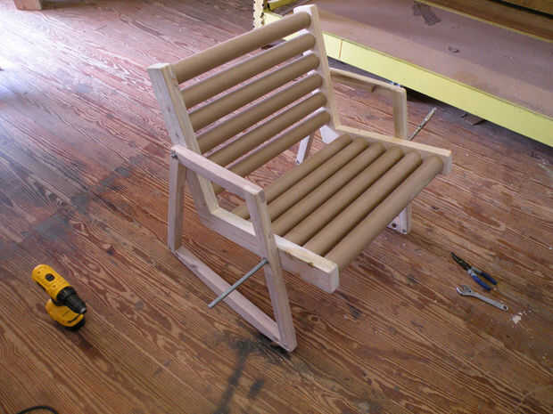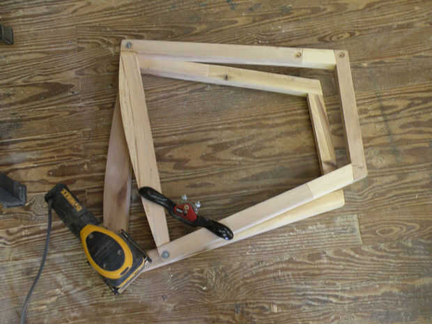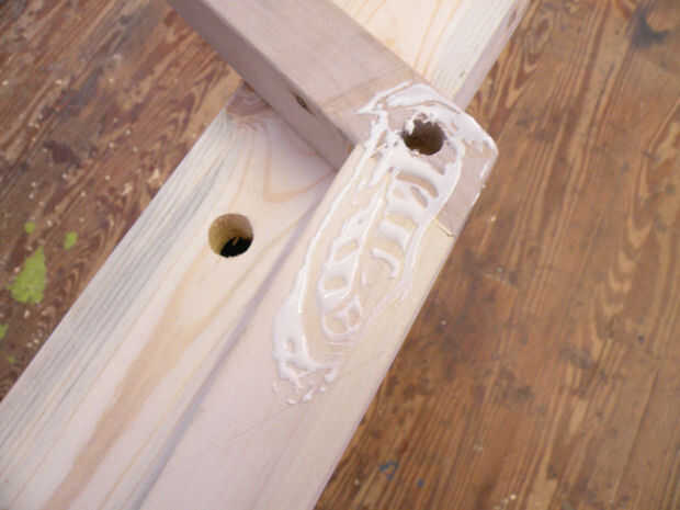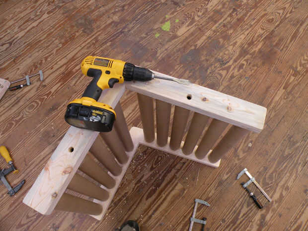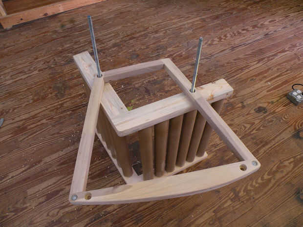 La parte difícil es conseguir las varillas a través y todo alineado. Poner pegamento en los marcos de la "A" y la silla donde se cruzan alrededor de los orificios. Línea de un lado, ponga la varilla a través de, droga hasta el otro lado con el pegamento y empuje a través de. Apriete todas las tuercas. Corte un lado de la barra y apriete hacia abajo. Necesitarás una llave o trinquete o algo de ambos lados, ya que la barra sólo se centrifugará a menos que usted trabaja en él de ambos lados. Utilice las barras en la parte inferior para apoyo de los "A" Marcos y torcer la madera si cuando estén curvados, ajustándolos hasta que tienen el mismo ancho aparte como son en la parte superior. Si utilizas las arandelas de bloqueo, necesidad de hilo no bloquear las tuercas.