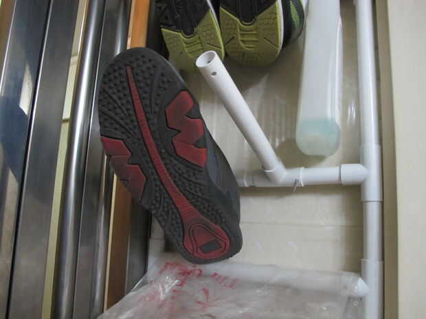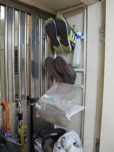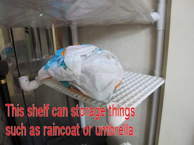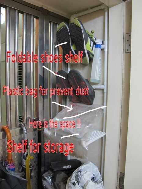 El espacio es de unos 20mm, hago una estructura de PVC (tubo de PVC de 20mm) para colgar zapatos "húmedos" y almacenamiento simple. (como paraguas y zapatillas)
