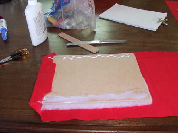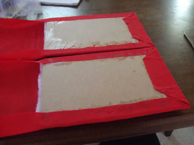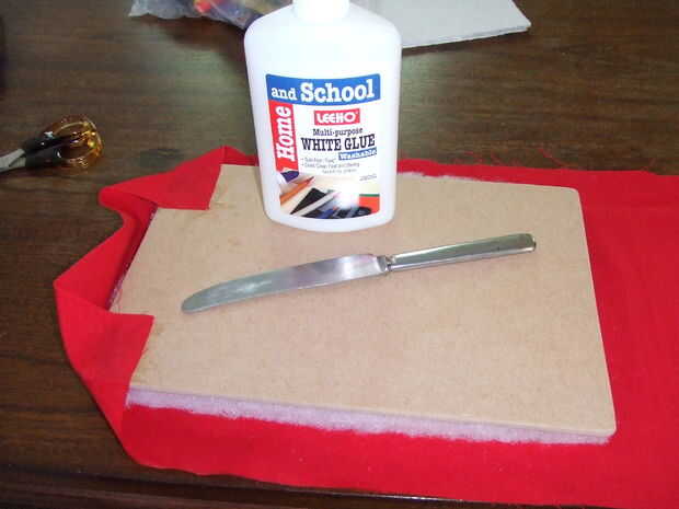 Este paso de construcción inicial consiste en poner la tela roja sobre la madera y el relleno. Había un poco de ensayo y error - principalmente asegurándose de que la tela se ve directamente en el frente. Tiré de las esquinas en primer lugar, que permite a las partes para luego ser reunió a más de. Salí de cierta holgura en la tela sobre el relleno así que fue redondeado. Tire bastante fuerte y es casi plana. Dulce.