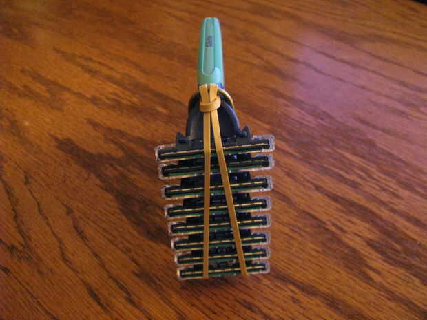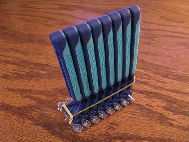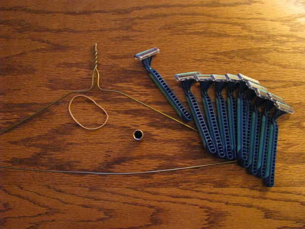 Esto mantiene sus nuevo rasuradoras desechables alineados en una fila organizada. Corte una sección de alambre y doblar sobre un zócalo. Atar el pie de alondra con una banda elástica en el extremo curvo. Las maquinillas de afeitar de carga y asegure con la cinta de goma.