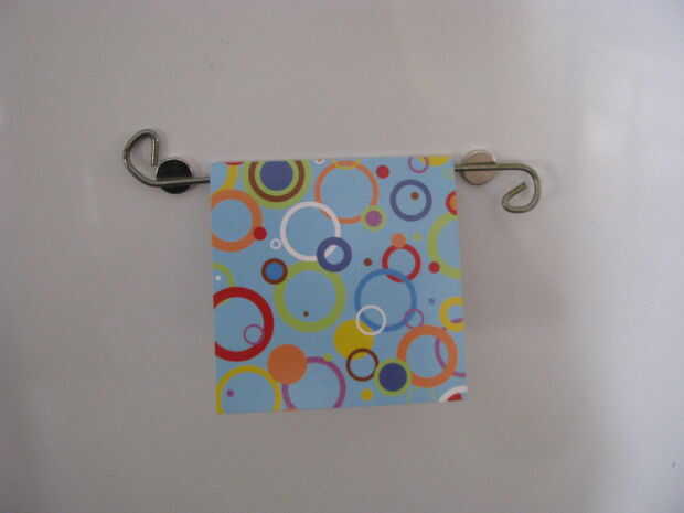 Poner dos imanes en la nevera. Tomar una sección de cable y hacer que los extremos tan elegante como usted quiere; espirales, círculos, estrellas, chica de tapa de barro y así sucesivamente. Coloque el cable contra los imanes. Cuelgue su tarjeta.