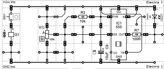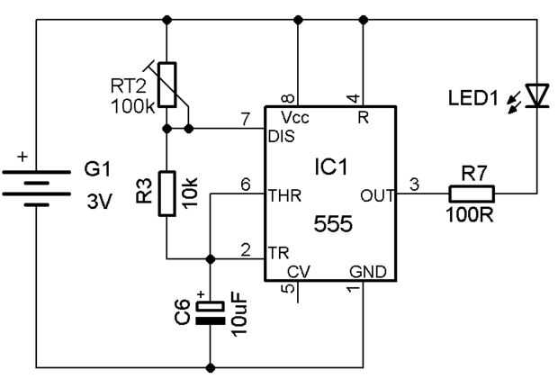 LED flasher con 555. Tasa de parpadeo está determinado por el circuito RC formado por RT2, R3 y C6.