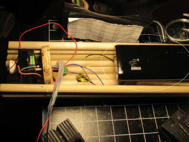 Ahora vino la elección de la batería. Estaba planeando utilizar baterías de C que son 1, 5V (son más pequeños que D) y muy robusto. El energizador MN1400 tiene 7AH. Tengo 12 C pilas en serie paralelo con los cables de conexión y papel de aluminio e hizo un funcionamiento de ensayo. (Ver imagen y archivo de excel). Me sentí muy decepcionada. El problema es que lo hice, solo metía 0.7A de las baterías. Duración de la batería se desplomó con cada uso. Luego hubo el problema de reemplazar las baterías muertas. Estaba pensando sobre esto durante unos días y me explicó el problema a mi hermano. Él dijo "¿por qué no utilizar el Banco de la energía?". Un foco de luz salió de mi cabeza. En este caso un LED sonó en mi cabeza. Perdón por el juego de palabras. Considero mi 13000mAh Anker Astro E4 (también llamado banco de potencia) antes, pero mi preocupación inicial con él fue siempre necesita un botón para pulsar para que encienda. Otra razón fue que un USB sólo repartió 2A. Yo esperaba que las baterías de C para dar a conocer de 3A. Pero no de esa manera.