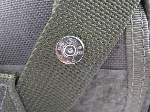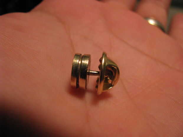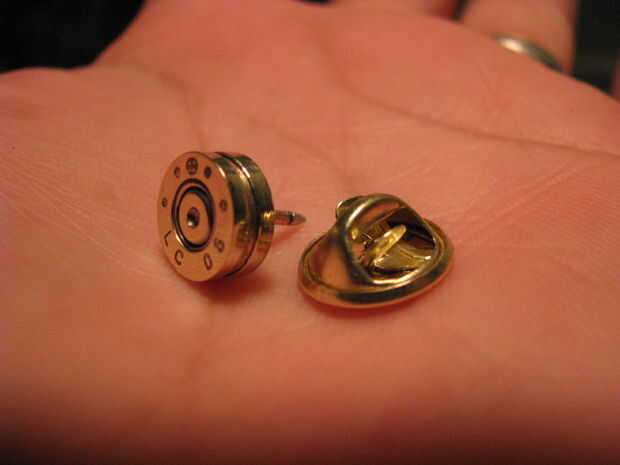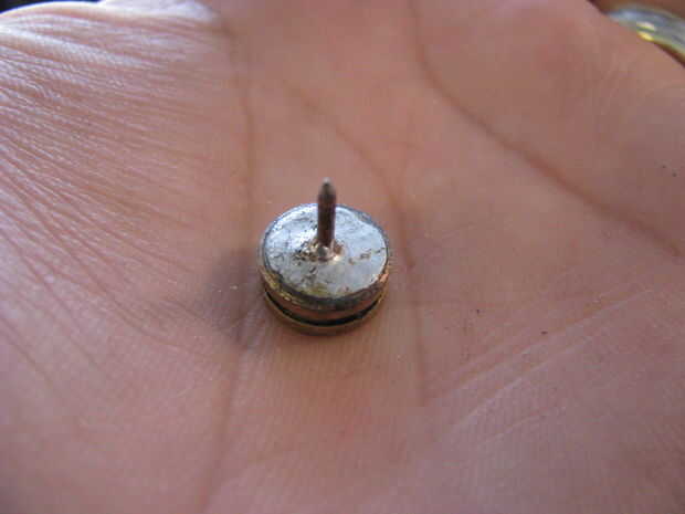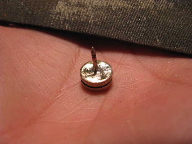 Para la parte del pin recibí un paquete de "pernos y de garras" de la tienda de artesanías; 10 por $3,00. Cortar el pin en el respaldo. Monte en una prensa del taladro y limar hasta que encaje en el agujero en la parte posterior de la cáscara.
