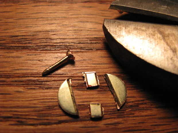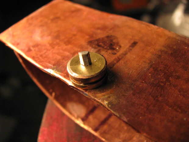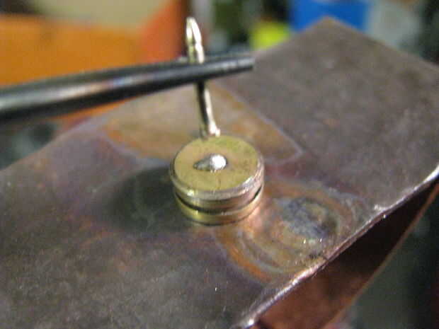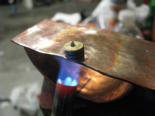 Coloque un trozo de soldadura en la cáscara. Calor de la parte inferior para que la soldadura se infiltra en el agujero. Mientras que la soldadura es fundida, colocar el pasador en el agujero. Presentar a cualquier soldadura excesiva.