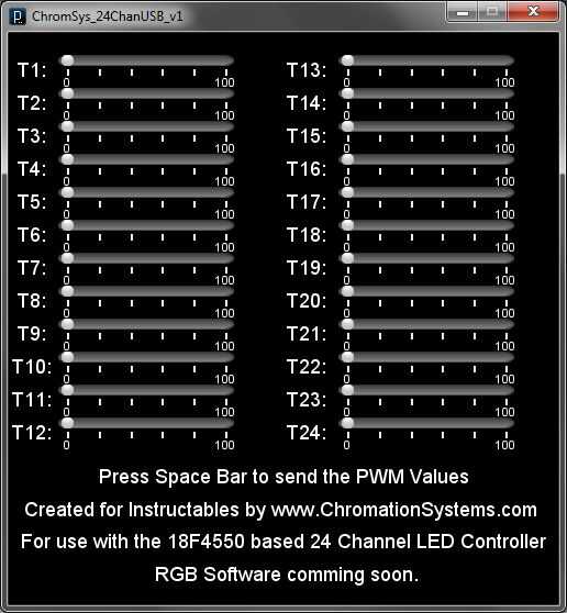 Es apenas 24 deslizadores, que están marcados el 0 - 100, posición de los cursores y pulsa barra espaciadora para enviar los datos a la placa de circuito. Convierte el número a 0 - 255 y la envía para ser utilizado en la rutina PWM. Si más o menos se envían bytes de datos, los datos utilizados en el PWM, esté fuera de la alineación y el circuito tendrá que ser reajustado.