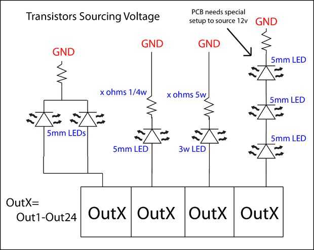 - LEDs de 5 mm, salidas de conjunto de lavabo o fuente dependiendo de las necesidades. Cada LED o sistema de LEDs en serie, están conectados con una resistencia limitadora actual en serie.