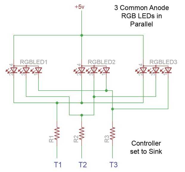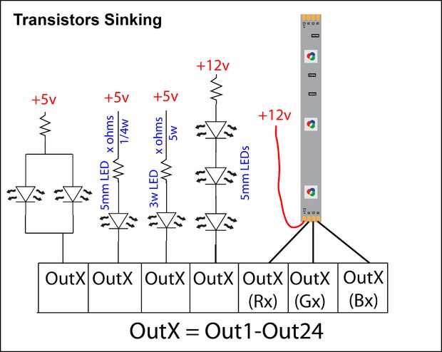 - de 12v RGB LED franja de luz, generalmente común ánodo base, configurar todas las salidas a hundirse, colores en las salidas y los 12v + está conectada al voltaje.