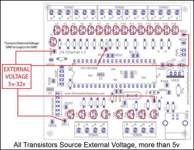 Cuando montan grandes cantidades de LEDs de alta corriente los puentes seleccionarlos debe conectarse directamente a la entrada de voltaje, por lo tanto no tanta corriente se corrió a través de los rastros de PCB.