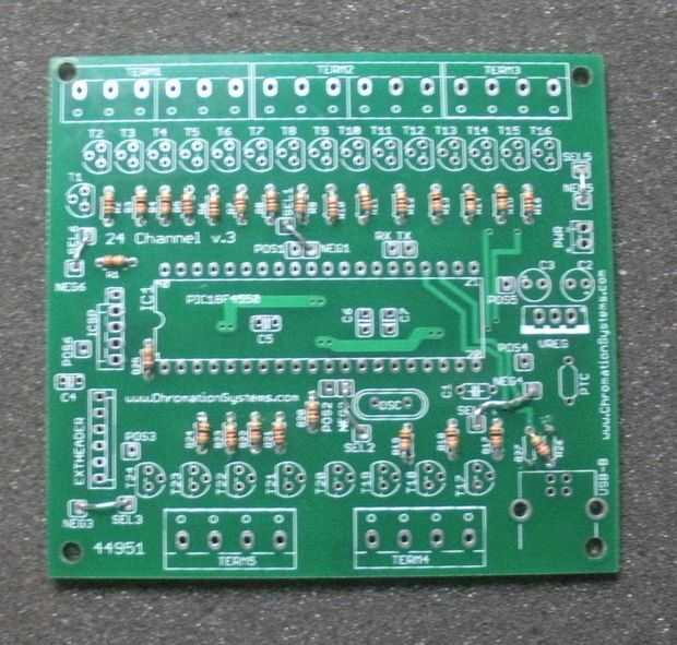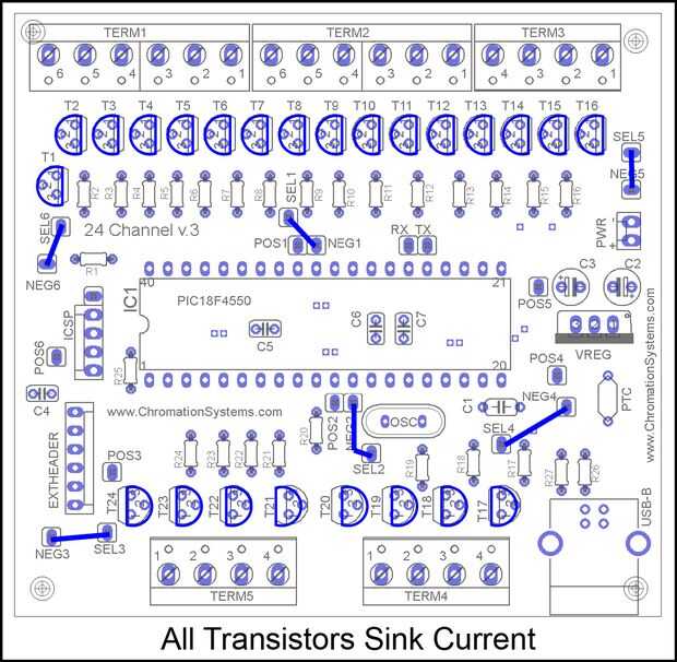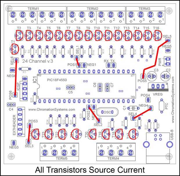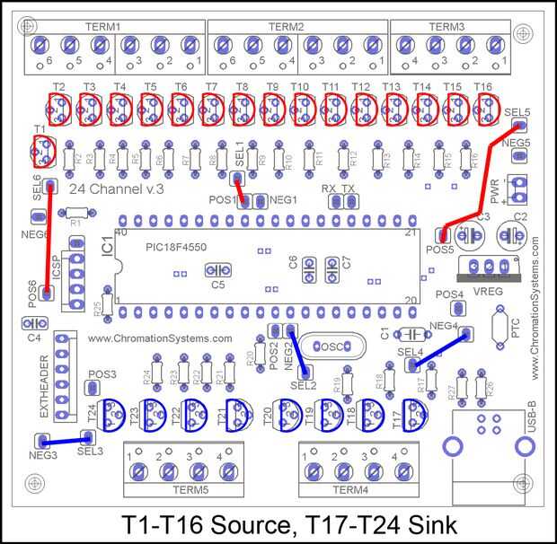 Esta tarjeta tiene jumpers para seleccionar si los transistores se hundir o abastecimiento de corriente. Transistores de la Junta se presentan con 16 en un lado y 8 al otro. Cada lado puede hundirse o voltaje de la fuente basado en los puentes SEL y la posición de los transistores. SELx a NEGx fregadero SELx a POSx para fuente.