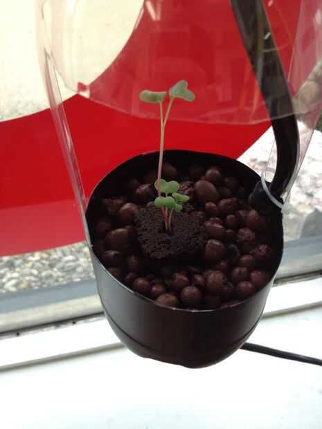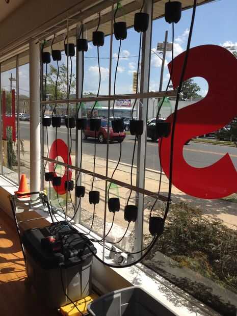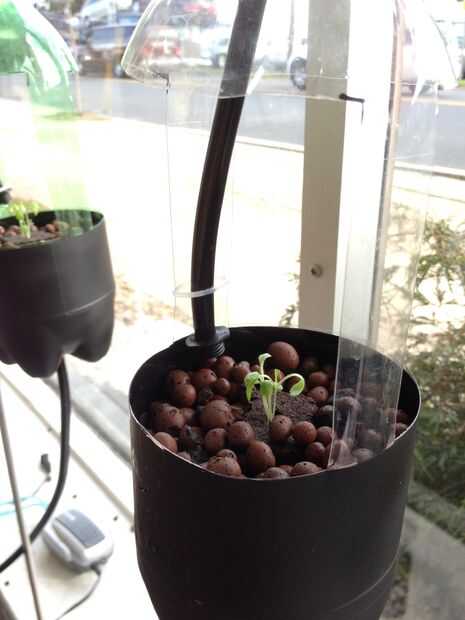 Hay botellas de refresco de 24 2 L que cada uno Sostenga una planta individual. Nutrientes se bombea desde el depósito inferior a la parte superior por 1/2" tubería y reducir en 1/4" tubería va en cada uno de los mejores ocho 2 L botellas de refresco y es goteo gravedad hacia abajo a través de los restantes 16 botellas y en el embalse de nutrientes inferior...
