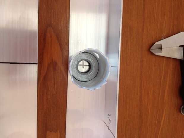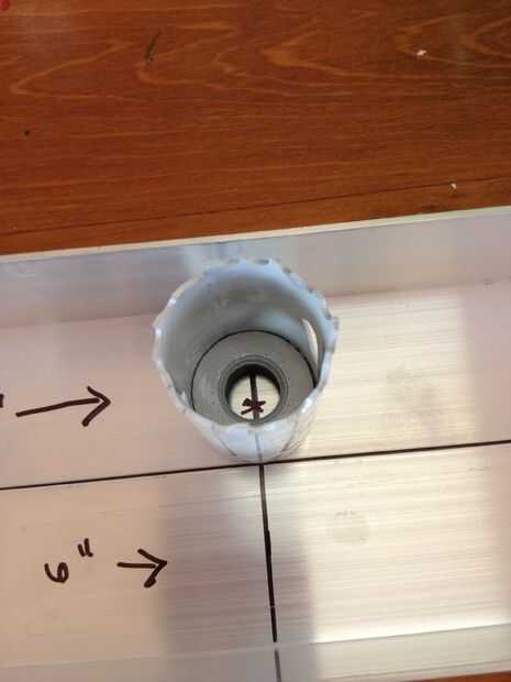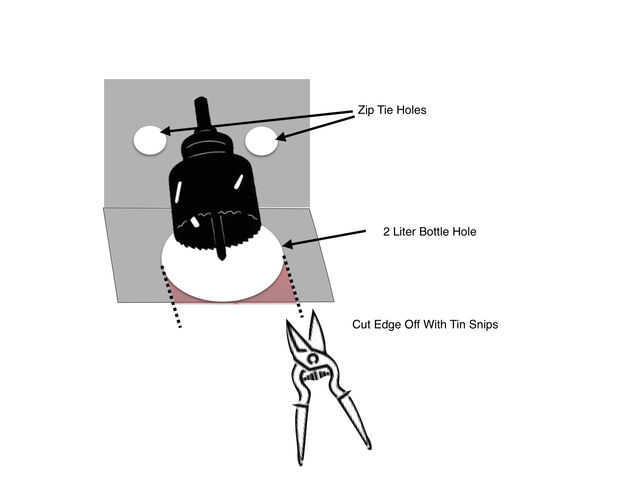 Gire la broca de Sierra de agujero para que puede ser utilizado como un marcador para crear su centro donde se iniciará broca de la sierras. Centro de agujeros con el borde en la mente. Una forma de zapato de caballo es necesario para apoyar el cuello de la botellas de 2 litros. Esto se logra cortando el agujero con el serrucho y luego cortar con tijeras los dos bordes.