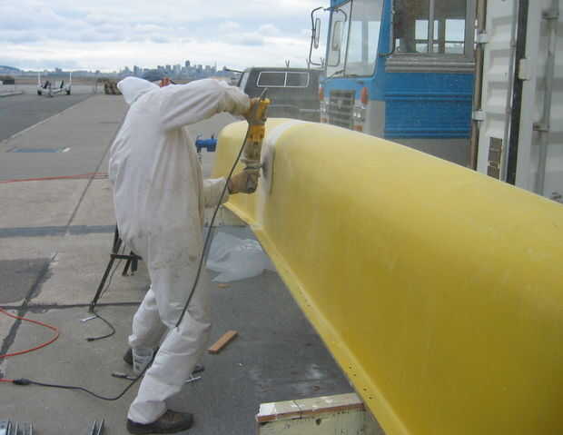 Ha pegado una tabla a una base de lijado y pegado una hoja completa de papel de lija de grano 80 a eso. Crea una tormenta de nieve artificial mientras lija el casco, y en unos pocos segundos es lisa y carenada. Wow.