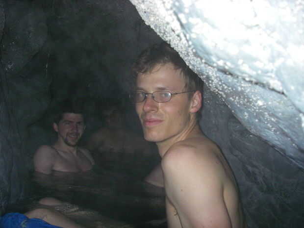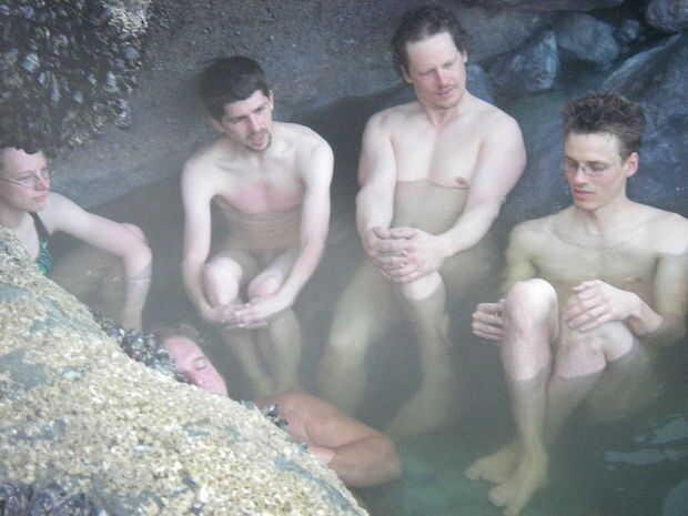 Nos relajamos en el resorte caliente hasta que subió la marea y olas de agua fría comenzaron a lavar en la primavera.