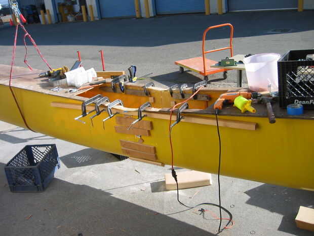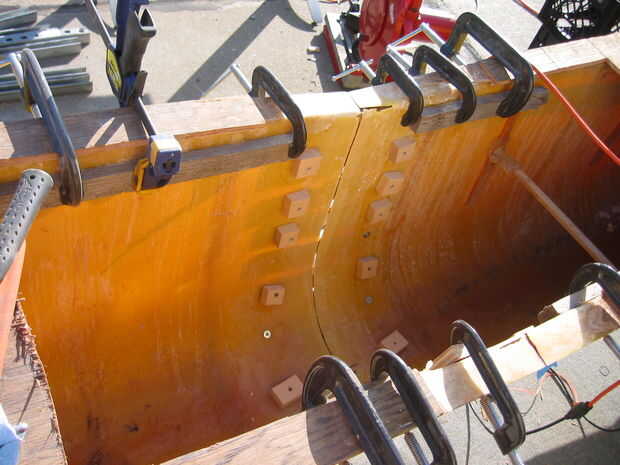 a continuación con abrazadera y jodido un montón de palos hacia el exterior de los cascos para mantenerlos en la alineación.