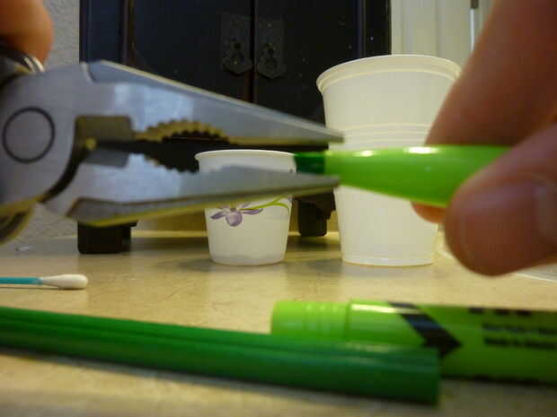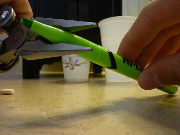 Utilizando los alicates, gancho agarrador y tire de la pieza de plástico delantera de la marcadora.