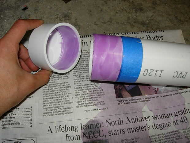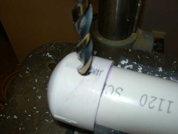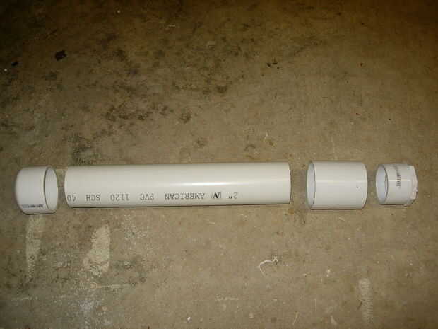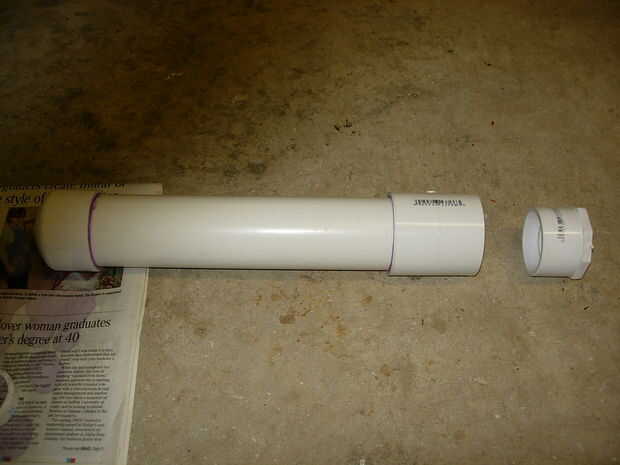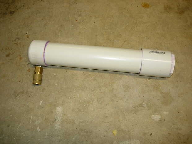 Esta es mi cámara, es un pedazo largo de 12 pulgadas de tubería de 2" de PVC con tapa de 2" por un lado y una de 2" acoplamiento en el otro, conectado a 2" acoplamiento es una de 2" a 1" reducción buje. Después de que la cámara estuviera pegada dejarlo reposar una hora (para que el pegamento podría curar parcialmente) luego perforé un orificio de 1/2" en el lado de la tapa 2" así podría hilo de rosca en el latón de rápida desconexión. No use cualquier cinta de teflón en este montaje, si empieza a escaparse poner alguna masilla de epoxy o JB weld en la sección donde encuentran los hilos de la cámara.