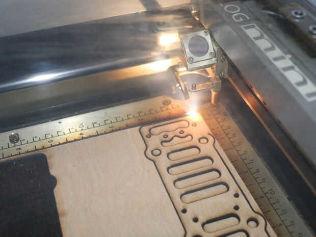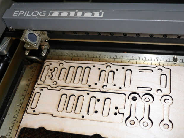 el bastidor de base tiene que ser cortado de la madera contrachapada del álamo 6 mm. se cortan las partes restantes del marco de contrachapado de abedul de 2 mm. Si no tienes una máquina de corte láser a imprimir los planos, pegar a la madera contrachapada y cortar las piezas del marco con un sierras de marquetería o una sierra de contornear.