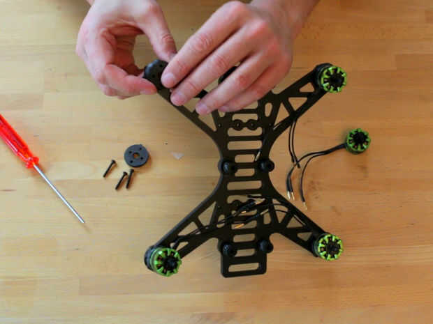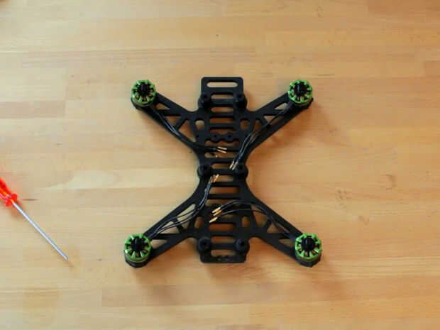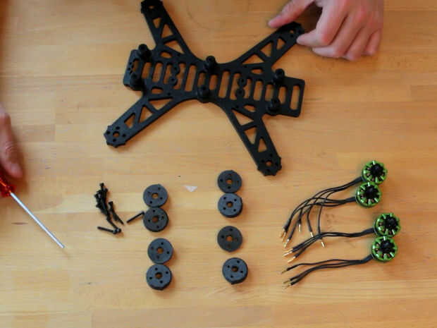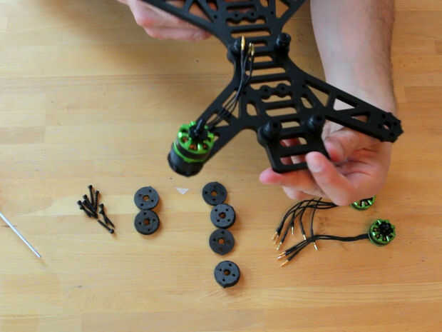 cada motor está atornillado a la estructura base con tres (para ahorrar el peso de la cuarta) m3x20 los pernos y las dos piezas de los soportes del motor. debe tenerse cuidado al orientar los soportes del motor. el motor debe ser inclinado hacia el centro de la estructura base.